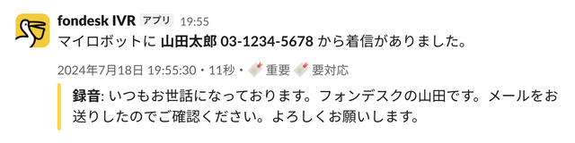 文字起こしされたメッセージが、お使いのチャットツールに送信されます。録音データの再生確認をしなくても、対応の要否が一目で判断できるようになります。