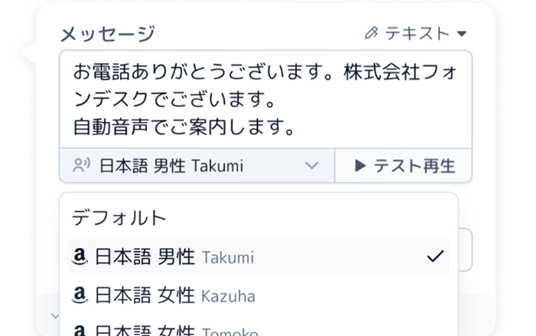 ご自身の声を録音し、音声案内として流すことができます。自動音声に抵抗感のあるお客様にも、親しみやすく自然な印象を与えられます。